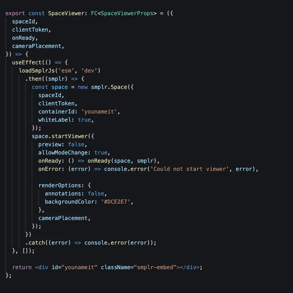 Integrate the Smplrspace viewer through our Javascript or TypeScript package and load spaces directly inside your application. Control how the viewer initializes, how it looks, and how it fits into your product’s interface.