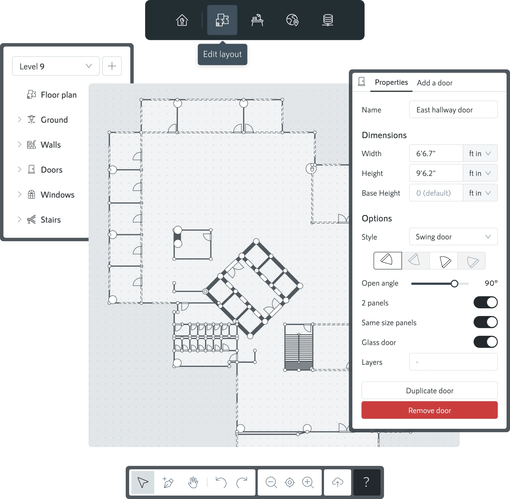 Upload floor plan images, set dimensions, and trace walls, doors, and windows with fast, precise tools. Snapping, clean geometry, and level-by-level editing give you an accurate digital replica of your space without any of the CAD or BIM complexity.