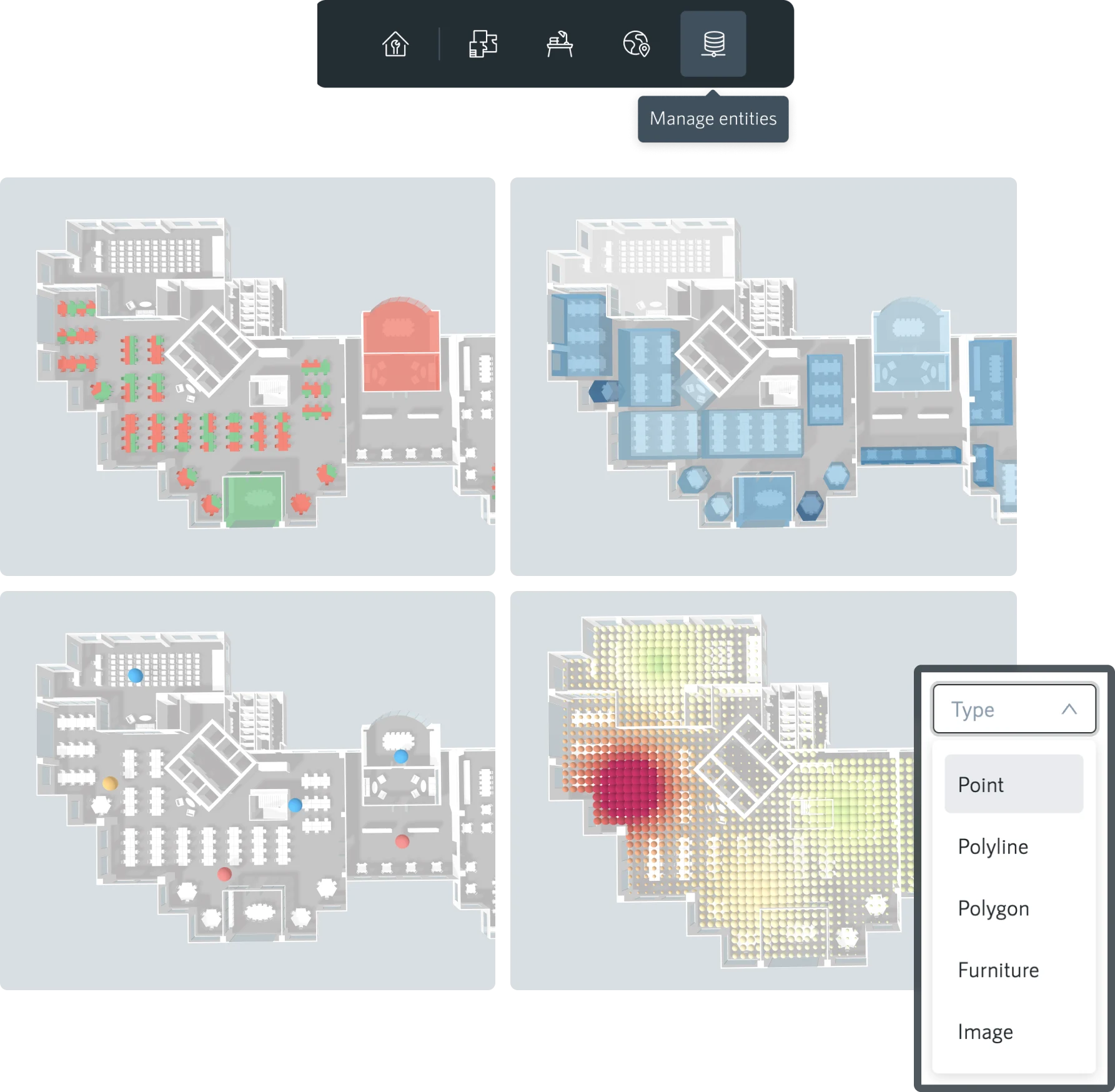 Create and update points, polygons, polylines, dotted polylines, icons, posters, equipment, and heatmaps. Render your data directly on the space, driven by your backend and updated in real time.